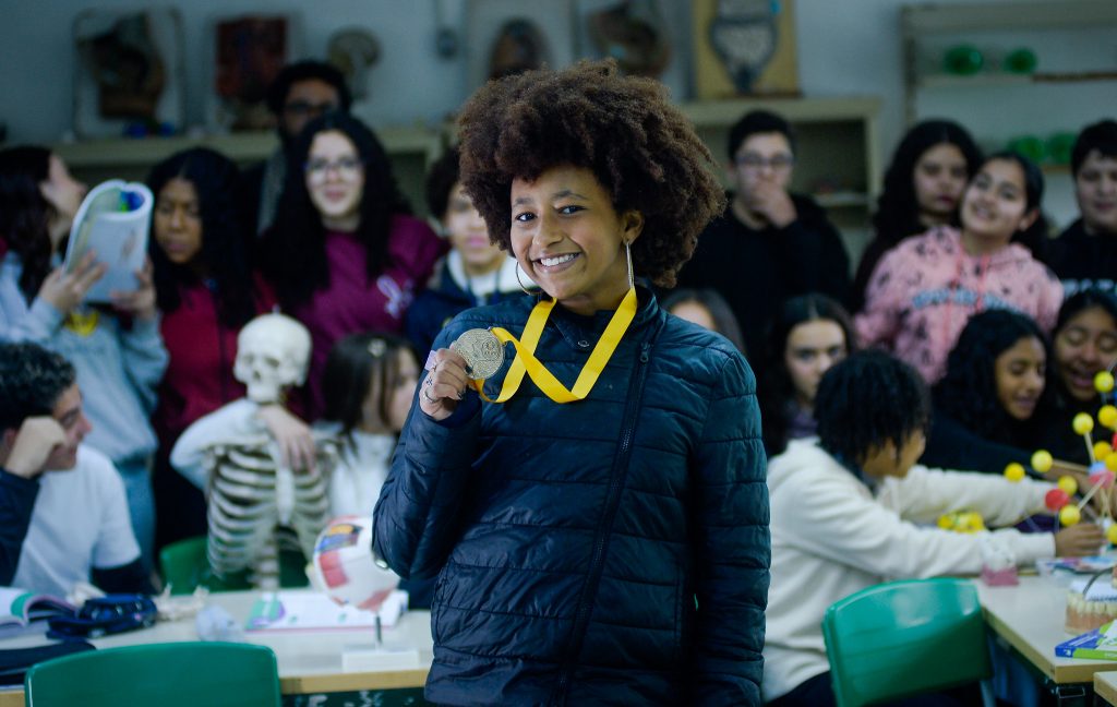 Na Escola Estadual Aristides de Castro, em São Paulo, a Olimpíada tem ajudado a descobrir talentos e a fortalecer os vínculos entre alunos e professores. Em 2024, a escola conquistou uma medalha de ouro com a estudante Lays Campos Nery, então no 7º ano e hoje matriculada no 8º ano do Ensino Fundamental.