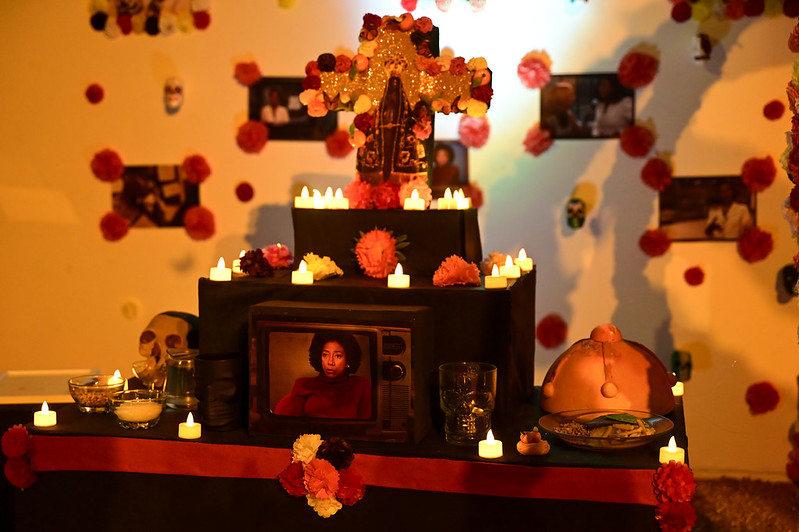 O altar da EE México presta homenagem à jornalista Glória Maria, referência no jornalismo brasileiro, e à indígena mexicana Maria Sabina, curandeira e xamã do povo mazateca, que viveu na Sierra Mazateca, em Oaxaca. A professora Marcela Mahfuz, do CEL da unidade, coordenou o trabalho com o apoio das alunas Ângela Vitória Laís Silva Souza e Emanuelly Ferreira Laurindo.