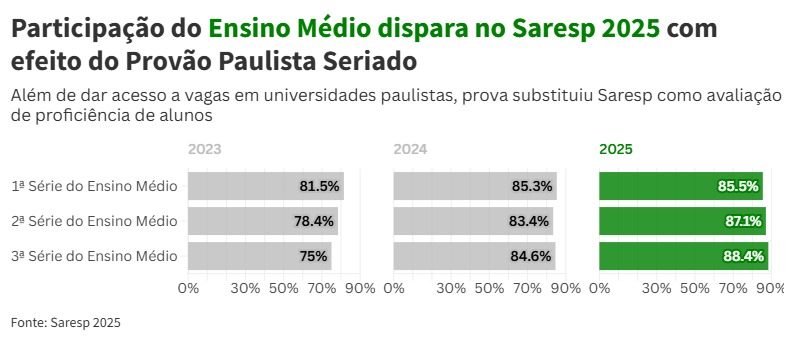 Desde 2023, essa foi a maior taxa de participação dos estudantes do Ensino Médio nas provas. O secretário Renato Feder destaca o efeito do Provão Paulista, a avaliação aplicada na mesma época que o Saresp e que, neste caso, garante acesso dos alunos da rede pública ao ensino superior.