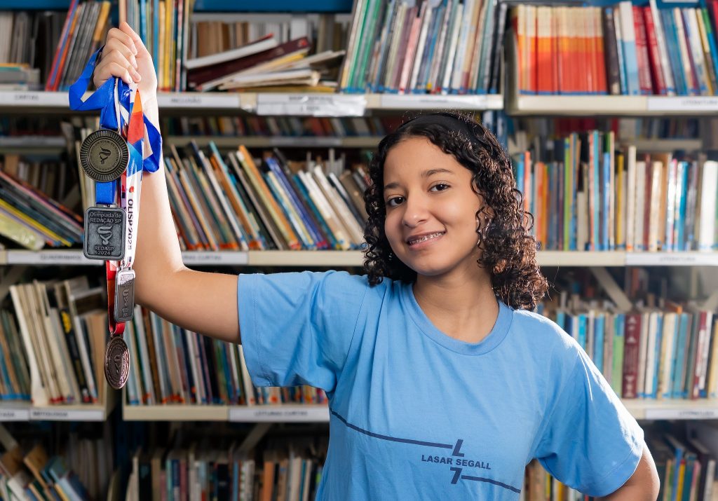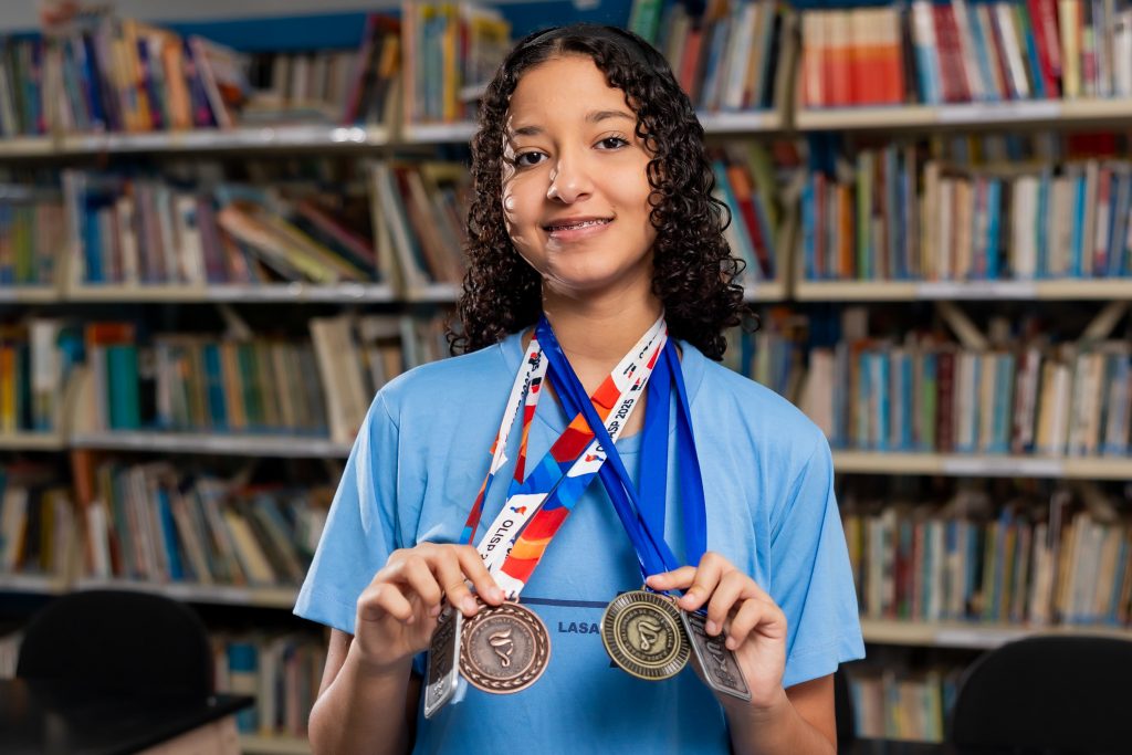 Uma medalha de ouro, duas de prata e uma de bronze. Após dois anos de competições, Diana Knox Carvalho de Oliveira chega ao Ensino Médio com uma bagagem e tanto. Aluna do 9º ano da Escola Estadual Lasar Segall, na capital paulista, a jovem conquistou os prêmios nas edições de 2024 e 2025 das olimpíadas de matemática e língua portuguesa, organizadas pela Secretaria da Educação do Estado de São Paulo (Seduc-SP) e exclusiva a estudantes da rede estadual.