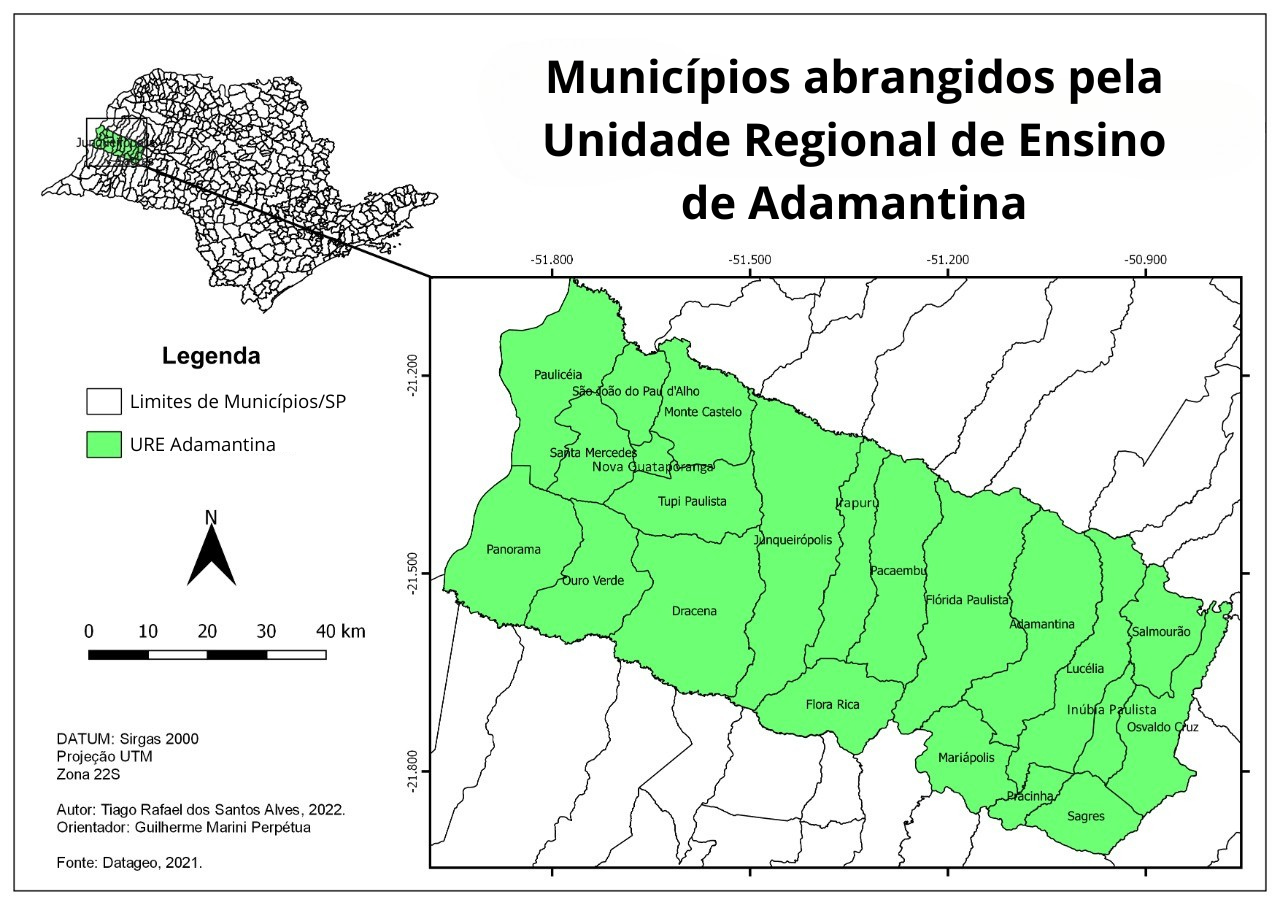 Atualmente, a Unidade Regional de Ensino de Adamantina tem jurisdição sobre 22 municípios: Adamantina, Dracena, Flora Rica, Flórida Paulista, Inúbia Paulista, Irapuru, Junqueirópolis, Lucélia, Mariápolis, Monte Castelo, Nova Guataporanga, Osvaldo Cruz, Ouro Verde, Pacaembu, Panorama, Paulicéia, Pracinha, Sagres, Salmourão, Santa Mercedes, São João do D’Alho e Tupi Paulista, conforme é possível observar no mapa abaixo: