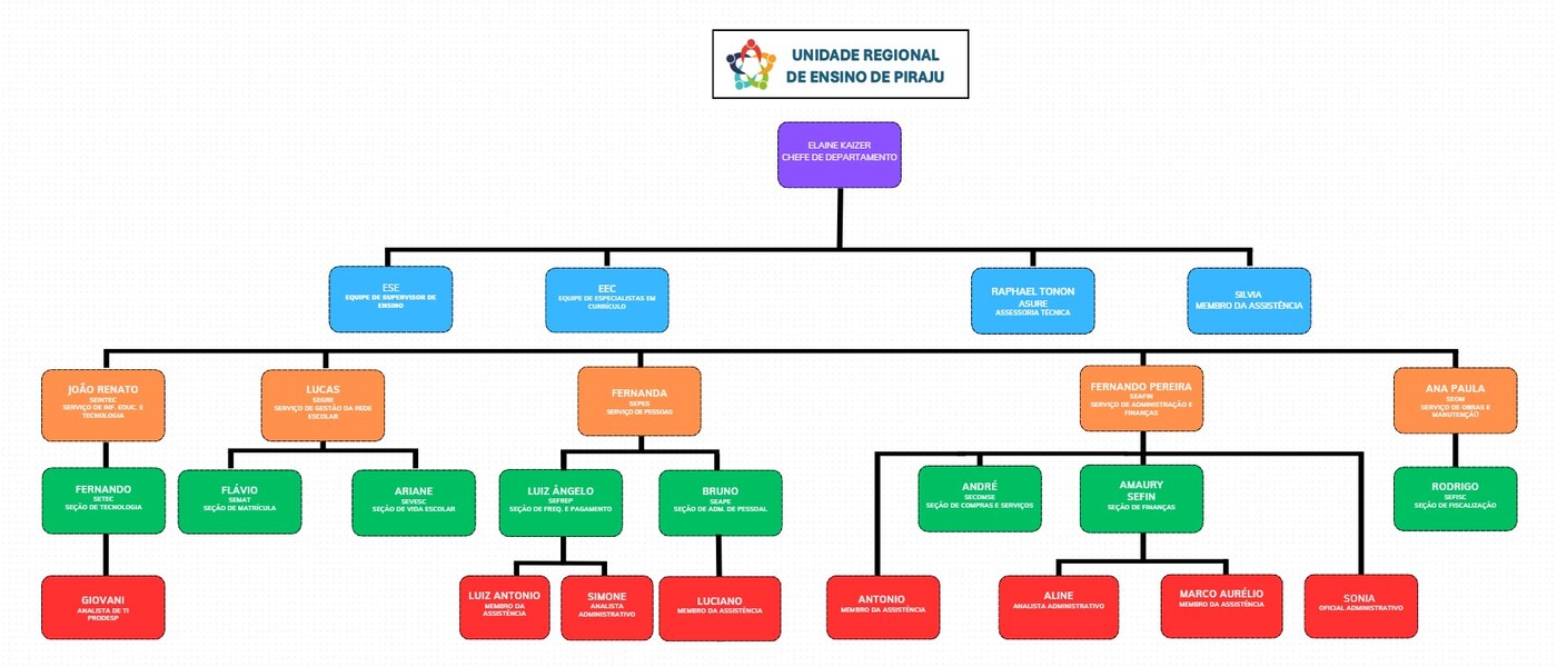 Conforme a Resolução SEDUC nº 108, de 28 de julho de 2025, a nova estrutura organizacional da Unidade Regional de Ensino de Piraju está detalhada conforme imagem abaixo.